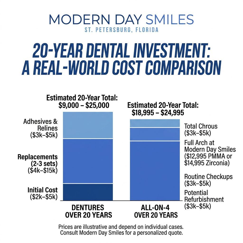 Full arch dental implants (sometimes called All-on-4 or teeth-in-a-day) replace an entire upper or lower arch of teeth with a permanent, fixed set anchored by four to six implants. In the Tampa Bay area, pricing ranges significantly depending on the provider.